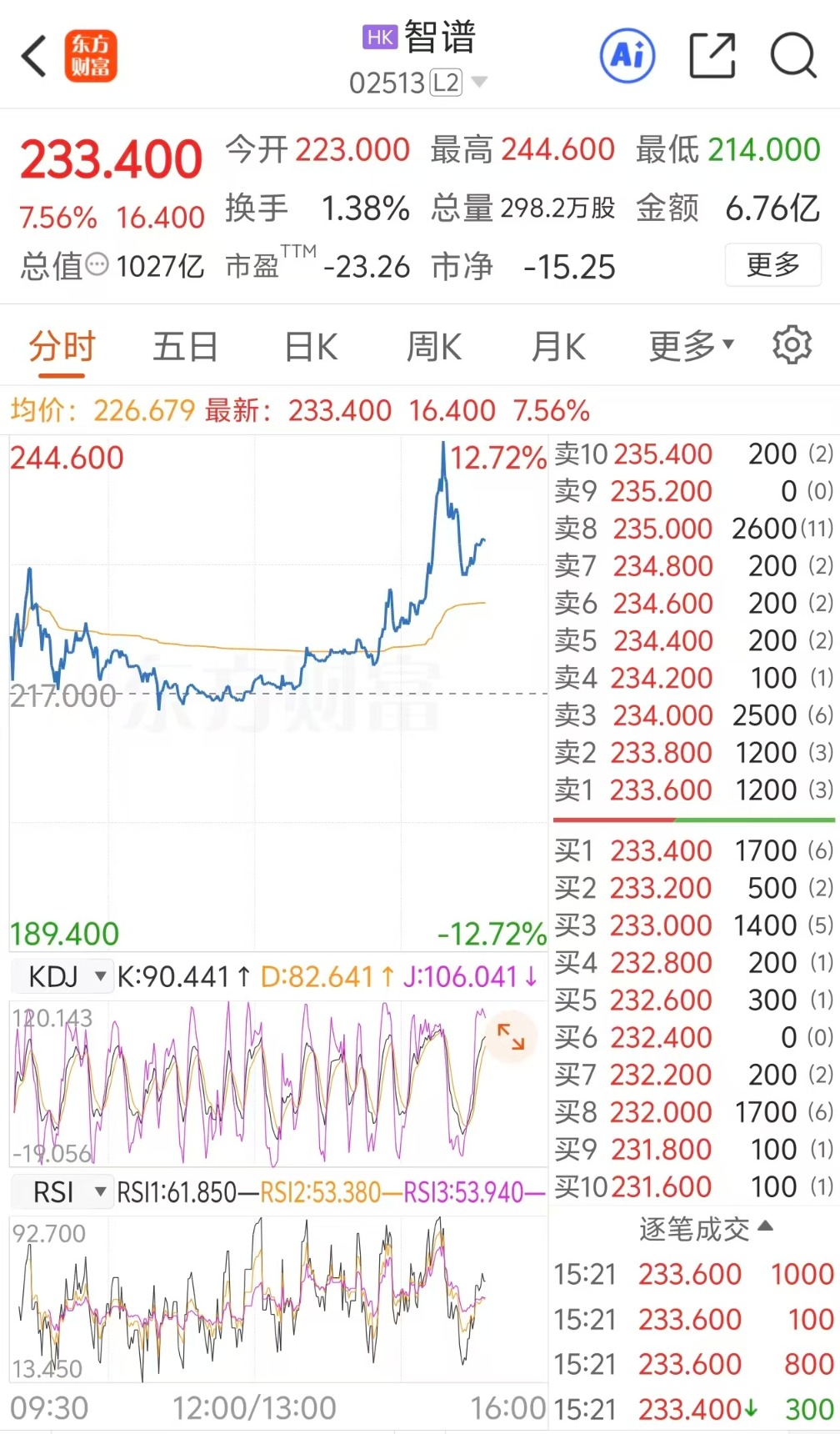 上证报中国证券网讯1月27日,智谱午后拉升,一度涨超12%,随后涨幅回落。截至15时21分,该股涨7.56%,报233.4港元/股,近两个交易日累计涨幅超20%。