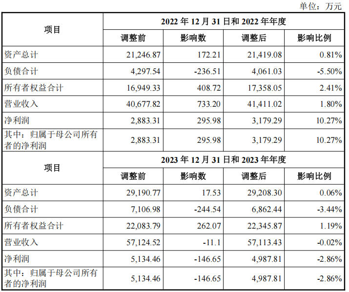 数据显示,2022年度至2023年度差错更正对公司净资产影响比例分别为2.41%和1.19%,对净利润影响比例分别为10.27%、-2.86%。
