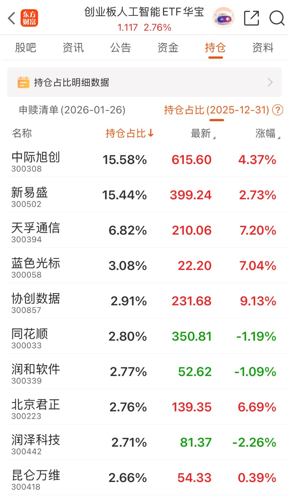 创业板人工智能ETF华宝(159363)是全市场首只跟踪创业板人工智能指数的 ETF。从赛道分布看,逾七成仓位聚焦算力硬件(含CPO、AI芯片等),超两成仓位布局AI应用,形成“算力+应用”双轮驱动的配置结构,前十大重仓股中 CPO龙头“易中天”占比极高。
