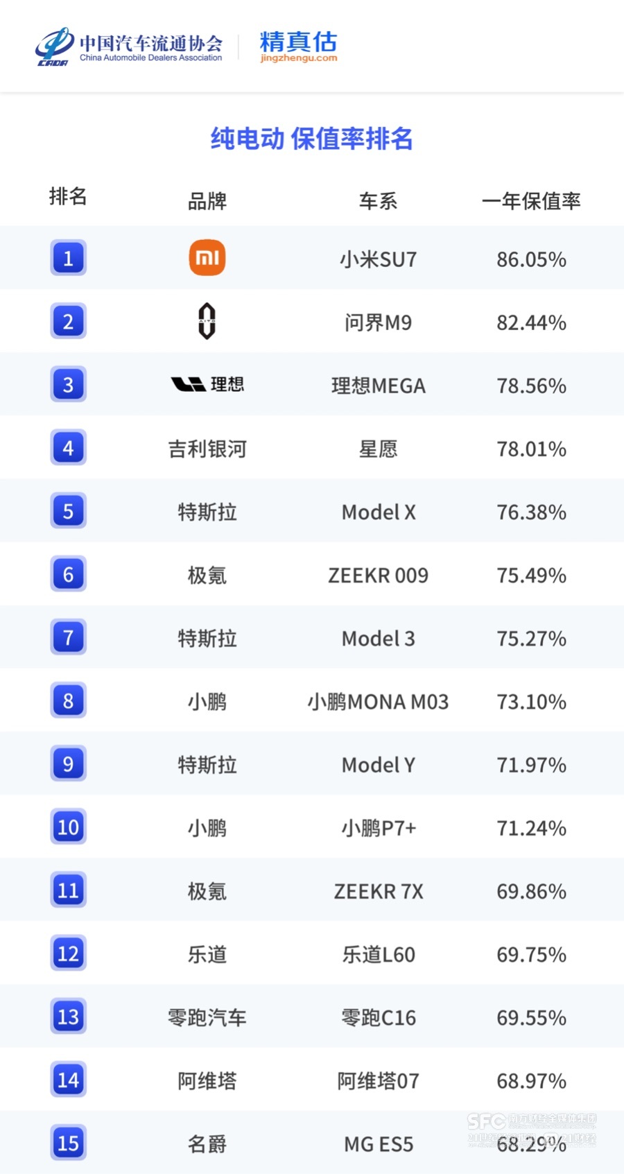 记者也注意到,推出“7年低息”贷款方案的车企,其主力车型保值率表现较高。据中国汽车流通协会最新发布的《2025年中国汽车保值率研究报告》,纯电动保值率排名前五的车为小米SU7、问界M9、理想MEGA、吉利银河(星愿)、特斯拉(Model X)。