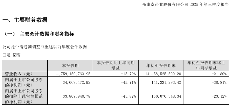 2025年前三季度,嘉事堂的归母净利润同比下降38.81%至1.41亿元,扣非后净利润同比下降23.12%至1.30亿元。