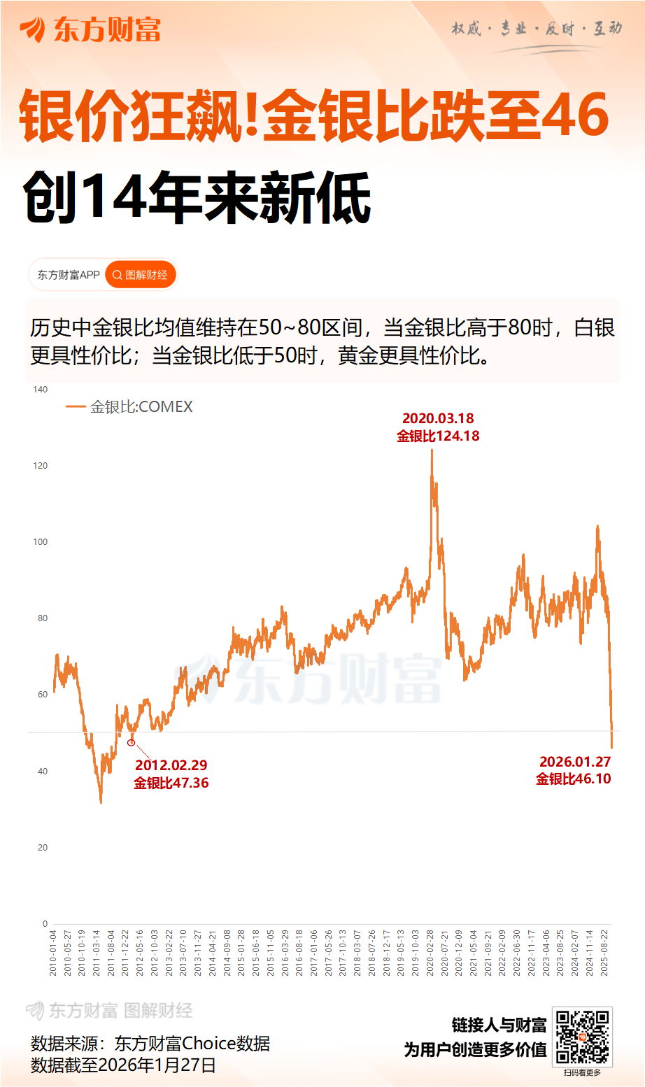 柏文喜指出,2026年1月,金银比一度跌至50左右,创下近13年的新低,表明白银相对黄金进入强势阶段。历史上金银比低于50通常意味着白银进入相对强势阶段。而在2025年11月,美国将白银列入关键矿产清单,加剧了供应链担忧和贸易商囤货行为,白银的战略资源属性得到强化。随着黄金价格飙升至每盎司5000美元,避险资金转向高波动、高杠杆的白银市场。本轮白银上涨是供需错配+产业刚需+金融属性的共振结果,与历史上的纯投机行情有本质区别。不过,他也提醒,光伏、新能源车、AI等产业的刚性需求为银价提供了坚实底部,但短期涨幅过大,确实积累了回调风险。