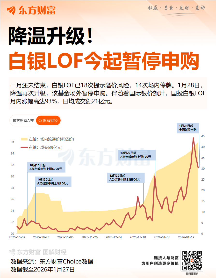 贵金属产品方面,易方达基金发布公告宣布,自1月28日起,暂停易方达黄金主题(QDII-LOF-FOF)A类人民币份额的申购及定期定额投资业务,赎回业务照常办理。近期因白银价格飙升而备受市场关注的国投白银LOF的A类份额、C类份额同样将于1月28日起暂停申购及定期定额投资业务,目前该LOF溢价率已高达46%以上。
