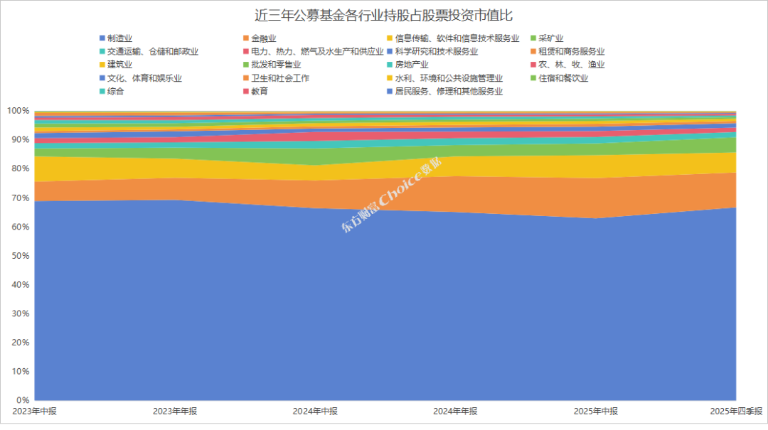 持股市值行业配置上,制造业、金融业、信息传输、软件和信息技术服务业占比位列前三,分别占比66.72%、12.07%和6.9%。