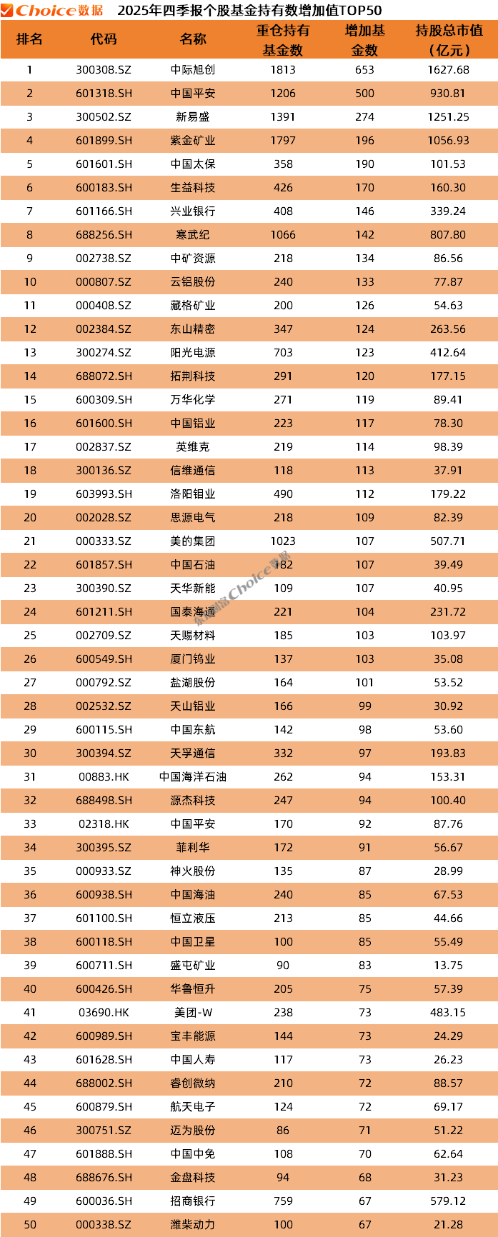 在个股持有基金数量增加榜单中,四季报重仓中际旭创的基金数相比三季报增加了653只,位列第一。该股2025年三季报显示被1160只基金重仓持有,四季报增加至1813只,持股总市值达到1627.68亿元。重仓中国平安的基金数量增加了500只;新易盛、紫金矿业、中国太保、寒武纪等重仓基金数较三季报均增加100只以上。