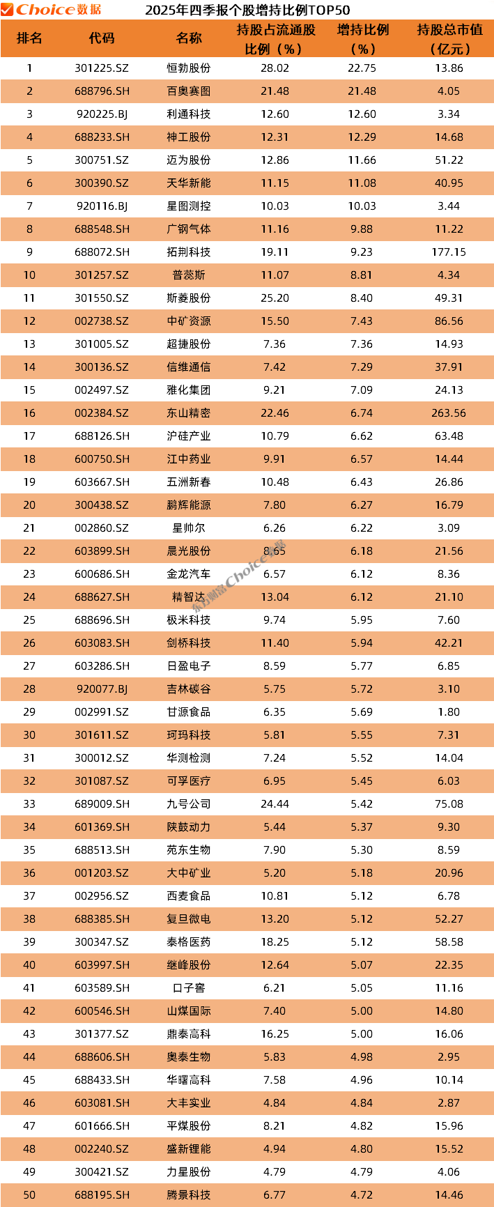 在基金重仓持股数量占流通股比例增加TOP50的榜单中,恒勃股份位列第一,2025年四季报基金重仓持股占流通股比例从三季报的5.27%增加至28.02%,增持了22.75%,持股数达到837.37万股,总市值13.86亿元。