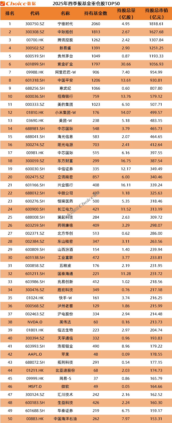 在四季报基金重仓股持股总市值TOP50中,宁德时代蝉联公募基金第一大重仓股,共2060只基金重仓持有该股,持股总市值1818.61亿元。中际旭创、腾讯控股分别以持股总市值1627.68亿元、1307.84亿元位列二、三位;贵州茅台降至第五位;1066只基金重仓持有寒武纪807.8亿元。