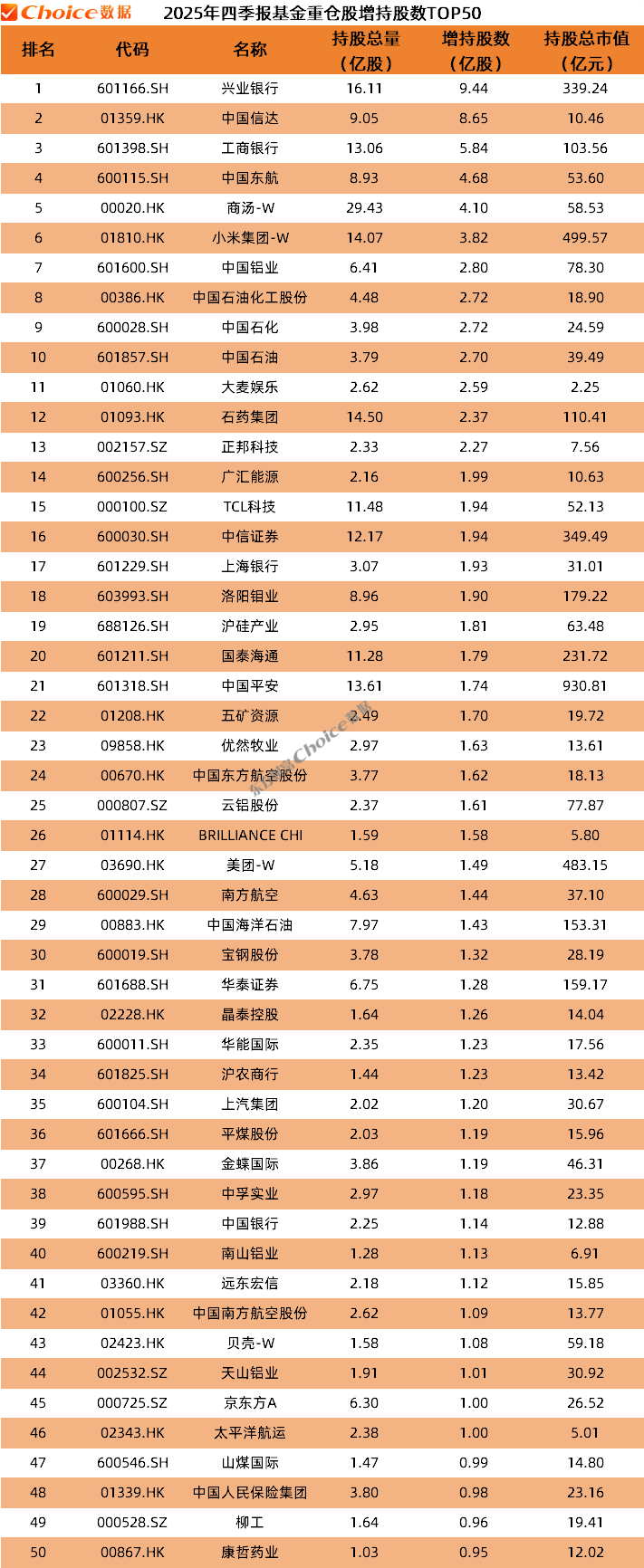 兴业银行增持股数位列第一,2025年四季报,基金重仓持有该股数量从三季报的6.67亿股增加至16.11亿股,增持了9.44亿股,总市值达到339.24亿元。
