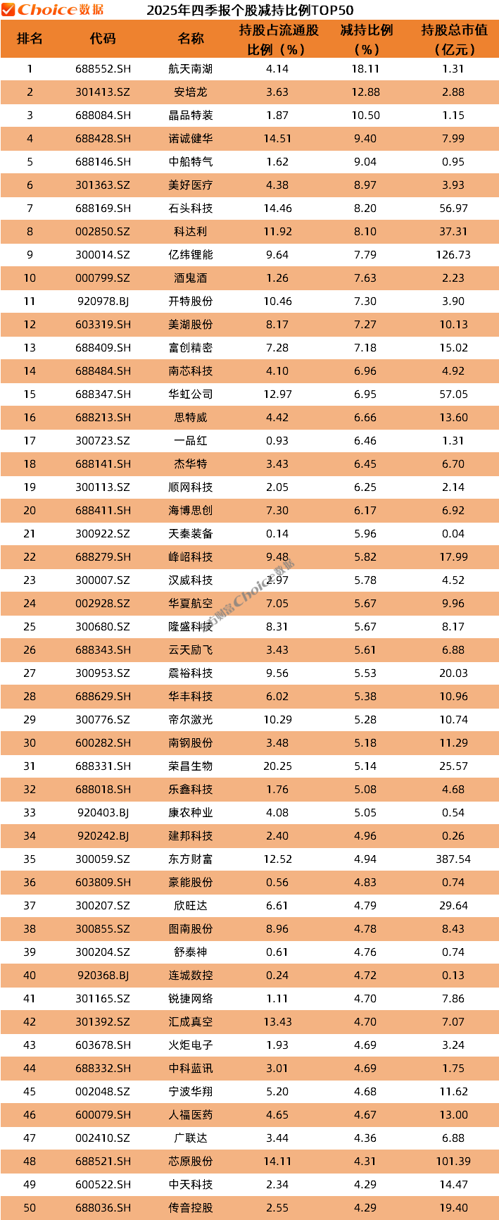航天南湖被减持比例最高,2025年三季报,基金重仓持有该股占流通比为22.25%,四季报降至4.14%,减持了18.11%;其次,安培龙被减持12.88%,晶品特装减持10.5%。