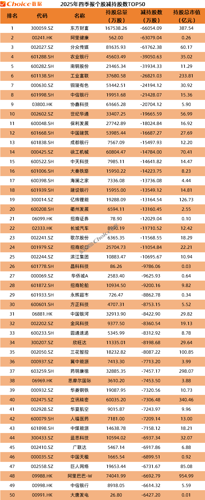 在个股减持TOP50的榜单中,东方财富、阿里健康、分众传媒四季度被减持超6亿股。