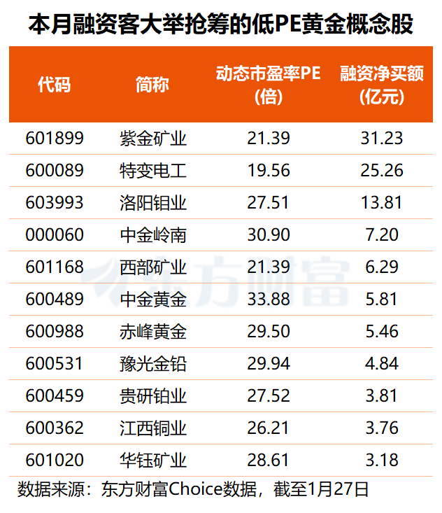 值得注意的是,上述25只低估值的黄金概念股中,有多股本月获得杠杆资金大幅加仓。其中,紫金矿业获融资客抢筹超31亿元,特变电工融资净买额也高达25.26亿元,洛阳钼业获融资净买入13.81亿元,中金岭南、西部矿业、中金黄金等4股融资净买额均在5亿元以上。