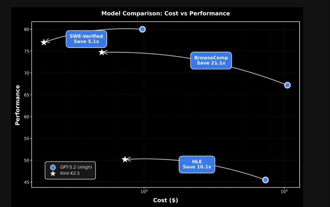 不过值得一提的是,Kimi的技术博客显示,K2.5在多项评测中运行成本要大幅低于GPT 5.2 xhigh。并且,K2.5还在HLE和BrowseComp两项测试中拿到了比GPT 5.2 xhigh更高的成绩。