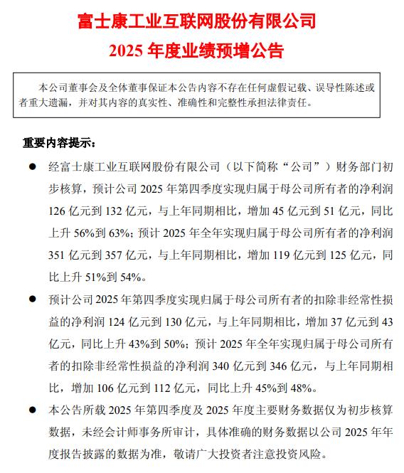 工业富联(601138.SH)公告称,预计公司2025年第四季度实现归属于母公司所有者的净利润126亿元到132亿元,与上年同期相比,增加45亿元到51亿元,同比上升56%到63%;预计2025年全年实现归属于母公司所有者的净利润351亿元到357亿元,与上年同期相比,增加119亿元到125亿元,同比上升51%到54%。2025年,公司800G以上高速交换机业务营业收入同比增幅高达13倍;2025年第四季度,800G以上高速交换机营业收入同比增长超4.5倍。2025年,公司云服务商AI服务器营业收入同比增长超3倍;2025年第四季度,云服务商AI服务器营业收入环比增长超50%,同比增长超5.5倍。