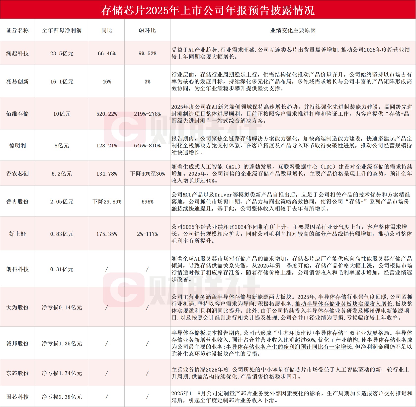 据不完全统计,截至发稿,包括澜起科技、兆易创新、佰维存储、德明利、香农芯创、普冉股份、好上好、朗科科技、大为股份、诚邦股份、东芯股份和国芯科技在内的多家存储芯片上市公司披露2025年度业绩预告。其中,澜起科技2025年净利同比预增52%-66%,德明利Q4净利预计环比增长645%-810%。