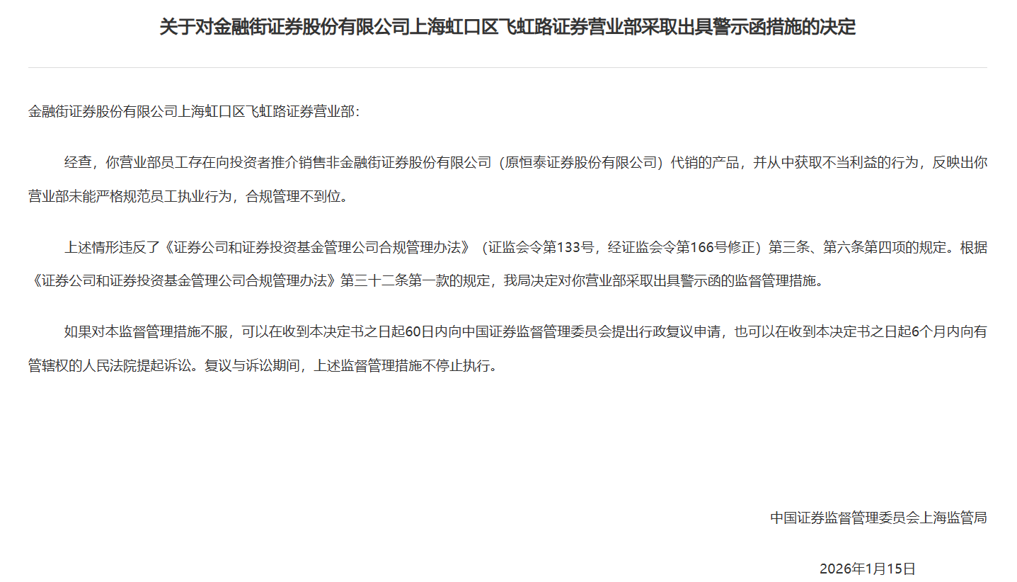 2025年12月31日,广东证监局发布罚单,金融街证券潮州熙泰大道证券营业部被采取出具警示函措施,营业部员工卢铭斌被采取监管谈话措施。卢铭斌在从业期间,存在向投资者销售非公司代销产品、从中获取不当利益,并违规承诺保本保收益的行为。