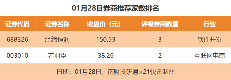 从券商推荐家数来看,1月28日有18家上市公司得到券商推荐,其中经纬恒润获得3家推荐,若羽臣获得2家推荐,华电科工等获得1家推荐。