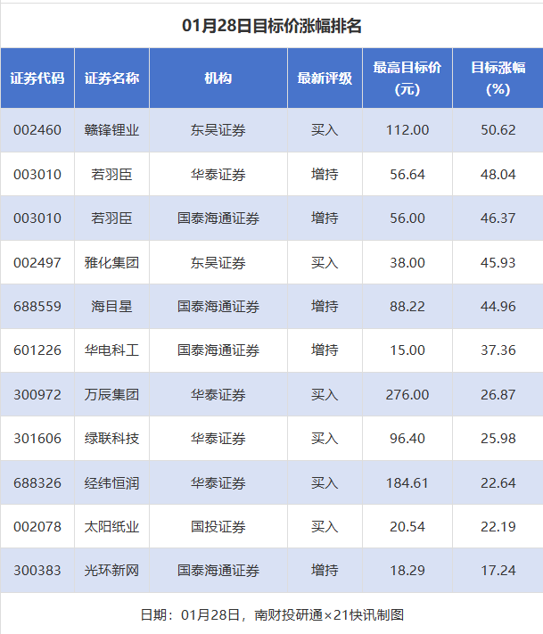 南财投研通数据显示,1月28日,券商给予上市公司目标价共11次,按最新收盘价计算,目标价涨幅排名居前的公司有赣锋锂业、若羽臣,目标价涨幅分别为50.62%、48.04%,分别属于能源金属和互联网电商行业。