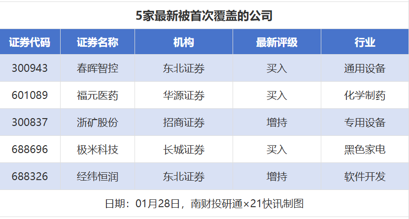 首次覆盖方面,1月28日券商共给出了5次首次覆盖,其中春晖智控、经纬恒润获得东北证券分别给予“买入”“增持”评级,福元医药获得华源证券给予“买入”评级,浙矿股份获得招商证券给予“增持”评级,极米科技获得长城证券给予“买入”评级。