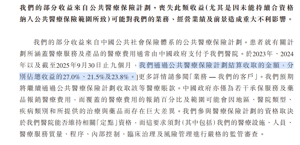招股书显示,2023年至2024年,公司通过公共医疗保险结算的金额占总收益比例从27%降至21.5%,且DRG/DIP模式下医保基金仅按预定标准报销,对骨科复杂手术、高危妊娠等资源消耗较高的病种,报销金额难以覆盖实际成本。