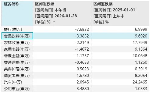 数据显示,在申万一级行业中,食品饮料在2025年以约9.7%的跌幅垫底;2026年以来,截至周三(1月28日)收盘,跌幅(3.38%)也排在第二。