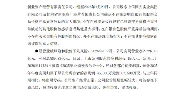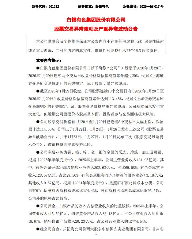 白银有色(601212.SH)公告称,公司股票于2026年1月28日、29日连续两个交易日收盘价格涨幅偏离值累计超过20%,属于股票交易异常波动。截至29日收盘,公司股票连续10个交易日内收盘价格涨幅偏离值累计达到113.48%,属于股票交易价格严重异常波动。公司基本面未发生重大变化,但近期公司股票价格脱离基本面,投资者参与交易面临极大风险。公司主要业务为铜、铅、锌、金、银等金属的采选、冶炼、加工及贸易。公司黄金、白银产品的收入占总营业收入的比重较低。此外,公司预计2025年年度实现归属于母公司所有者的净利润为亏损4.5亿元到亏损6.75亿元,与上年同期相比,将出现亏损。