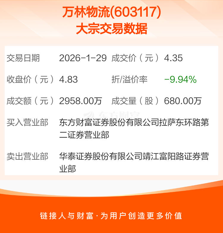 2026年1月29日,万林物流发生1笔大宗交易,共成交680.00万股,成交金额2958.00万元,占其流通市值比例为1.02%。