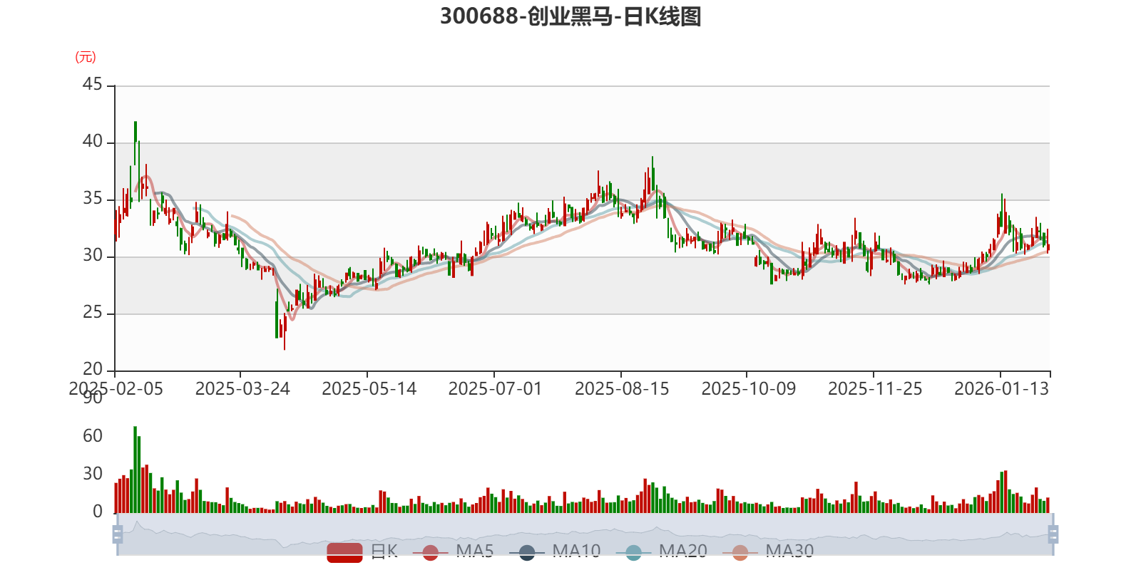 中证智能财讯创业黑马(300688)1月29日晚间披露2025年度业绩预告,预计2025年归母净利润亏损4500万元至5500万元,上年同期亏损1.06亿元;扣非净利润亏损5100万元至6100万元,上年同期亏损1.04亿元。以最新收盘价计算,市净率(LF)约12.98倍,市销率(TTM)约31.42倍。