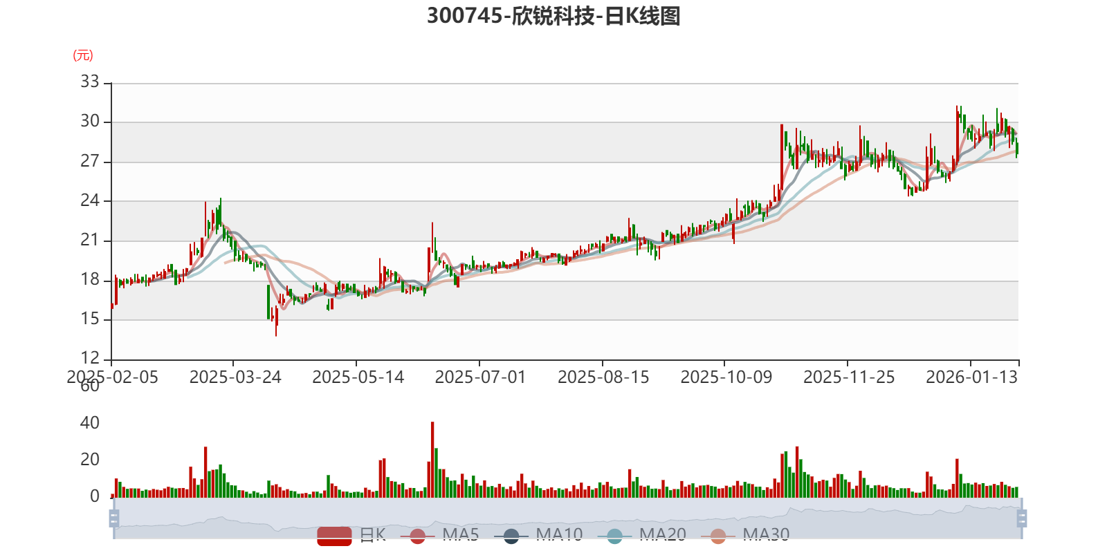 中证智能财讯欣锐科技(300745)1月29日晚间披露2025年度业绩预告,预计2025年实现营业收入26亿元至28亿元;归母净利润亏损1.1亿元至1.3亿元,上年同期亏损1.22亿元;扣非净利润亏损1.39亿元至1.6亿元,上年同期亏损1.6亿元。以最新收盘价计算,市净率(LF)约2.06倍,市销率(TTM)约1.72倍。