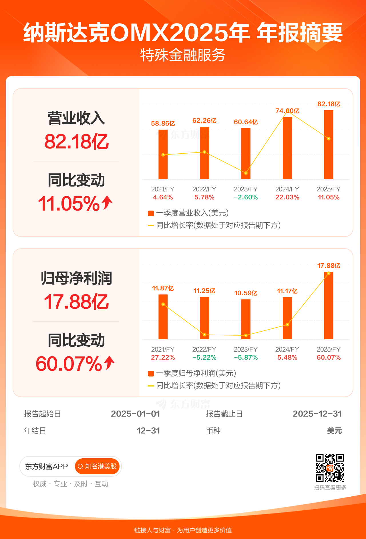 纳斯达克OMX1月29日发布年报业绩,截至2025年12月31日的12个月内,该公司营业收入82.18亿美元,同比增长11.05%;公司权益持有人应占溢利(归母净利润)17.88亿美元,同比增长60.07%。