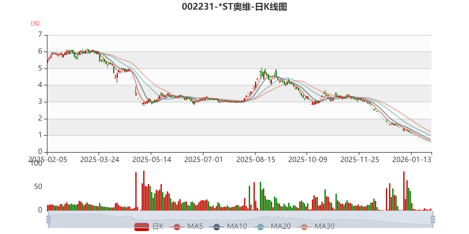 中证智能财讯 *ST奥维(002231)1月29日晚间披露2025年度业绩预告,预计2025年实现营业收入3400万元至5000万元;归母净利润亏损1.33亿元至2.66亿元,上年同期亏损4611.47万元;扣非净利润亏损1.15亿元至2.3亿元,上年同期亏损5836.77万元;基本每股收益-0.3835元/股至-0.7669元/股。以最新收盘价计算,市净率(LF)约2.54倍,市销率(TTM)约4.96倍。