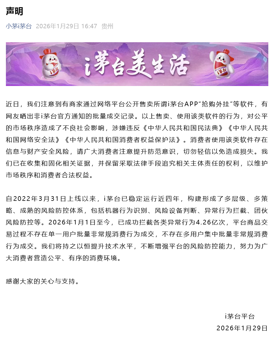 贵州茅台表示,自2022年3月31日上线以来,i茅台已稳定运行近四年,构建形成了多层级、多策略、成熟的风险防控体系,包括机器行为识别、风险设备判断、异常行为拦截、团伙风险防控等。2026年1月1日至今,已成功拦截各类异常行为4.26亿次。平台商品交易过程不存在单一用户批量非常规消费行为成交,不存在多用户集中批量非常规消费行为成交。