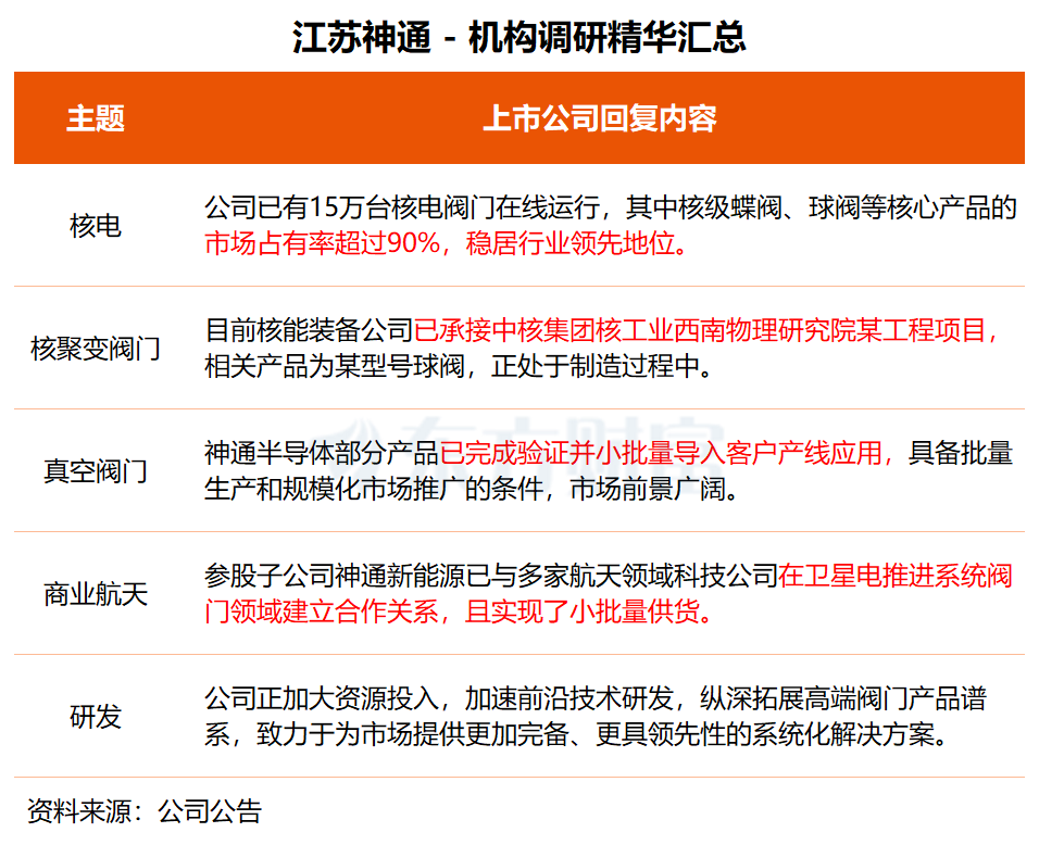 在调研中,江苏神通透露,全资子公司江苏神通核能装备有限公司作为公司深耕核能应用领域的独立实体,目前已承接中核集团核工业西南物理研究院某工程项目,相关产品为某型号球阀,正处于制造过程中。