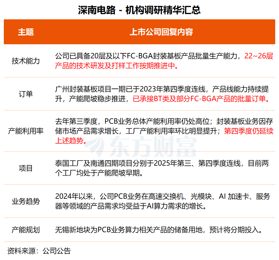 在调研中,深南电路透露,公司综合产能利用率仍处于相对高位。2025年第三季度,PCB业务总体产能利用率仍处于高位;封装基板业务因存储市场产品需求的增长,工厂产能利用率环比明显提升。2025年第四季度仍延续上述趋势。
