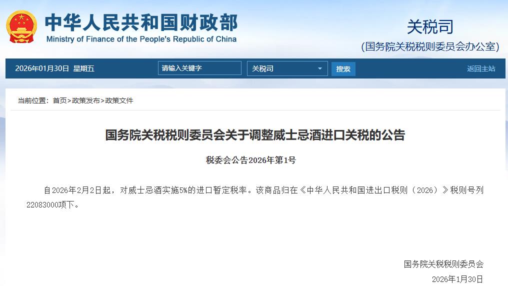 自2026年2月2日起,对威士忌酒实施5%的进口暂定税率。该商品归在《中华人民共和国进出口税则(2026)》税则号列22083000项下。