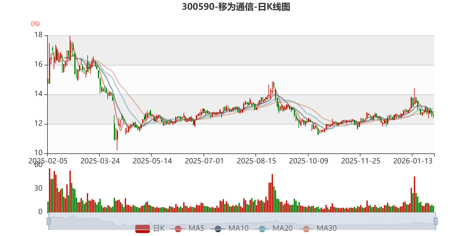 中证智能财讯移为通信(300590)1月30日晚间披露2025年度业绩预告,预计2025年归母净利润6661.62万元至8247.72万元,同比下降48%-58%;扣非净利润预计5246.29万元-6664.2万元,同比下降53%-63%。以1月30日收盘价计算,移为通信目前市盈率(TTM)约为70.21倍-86.92倍,市净率(LF)约3.18倍,市销率(TTM)约6.77倍。