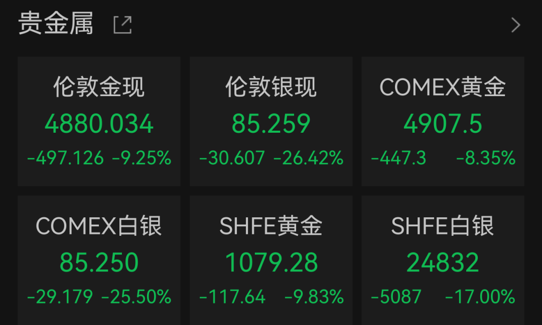 国际贵金属价格大幅杀跌,现货白银价格一度跌超36%,黄金最高跌超12%。截至收盘,COMEX黄金期货当月连续合约下跌447.30美元,跌幅8.35%,报4907.5美元/盎司。COMEX白银期货当月连续合约下跌29.18美元,跌幅25.50%,报85.25美元/盎司。现货黄金下跌近500美元,跌幅9.25%,报4880美元/盎司。现货白银下跌超30美元,跌幅26.42%,报85.259美元/盎司。