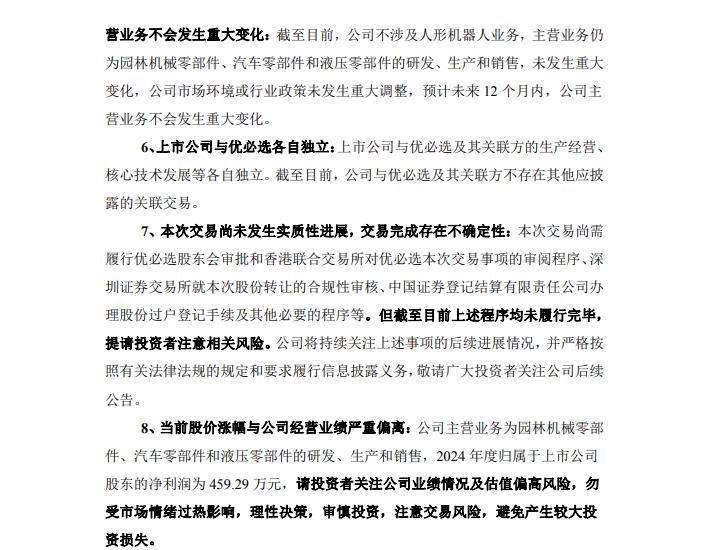 2月1日,锋龙股份公告称,公司股票自2025年12月25日至2026年1月23日连续17个交易日涨停,涨幅405.74%,多次触及异常波动。公司于1月26日起停牌核查,2月2日开市起复牌。目前公司不涉及人形机器人业务,2024年净利润459.29万元,股价已严重脱离基本面。优必选承诺收购完成后36个月内,无向上市公司注入资产计划。本次交易尚需多项程序,完成存在不确定性。此外,内幕信息知情人中,锋驰投资减持、国信证券买卖股票均不涉及内幕交易。