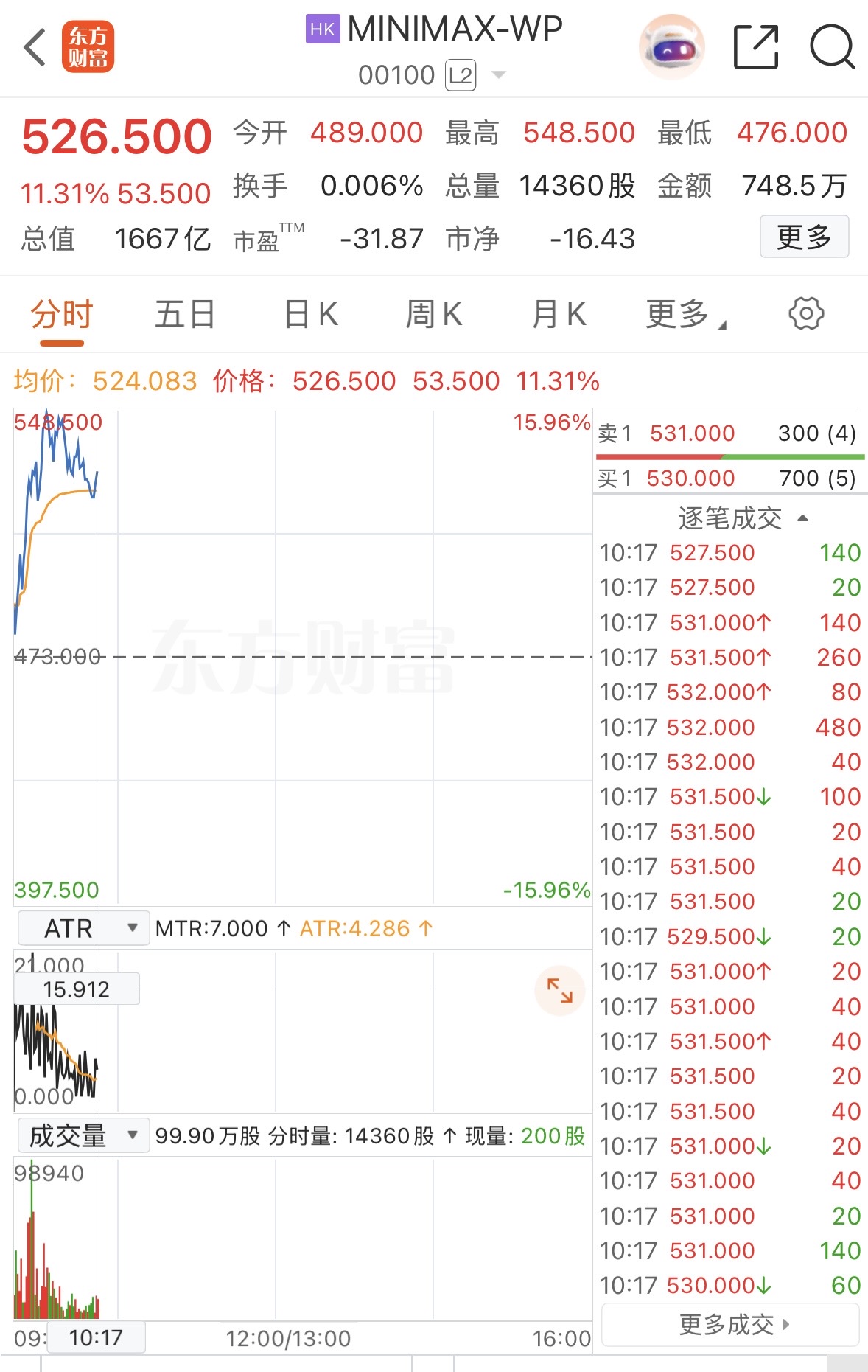 2月2日,MINIMAX-WP早盘高开,开盘涨3.38%,随后震荡上行,一度涨超15%。截至10时17分,MINIMAX-WP涨11.31%,报526.5港元/股。