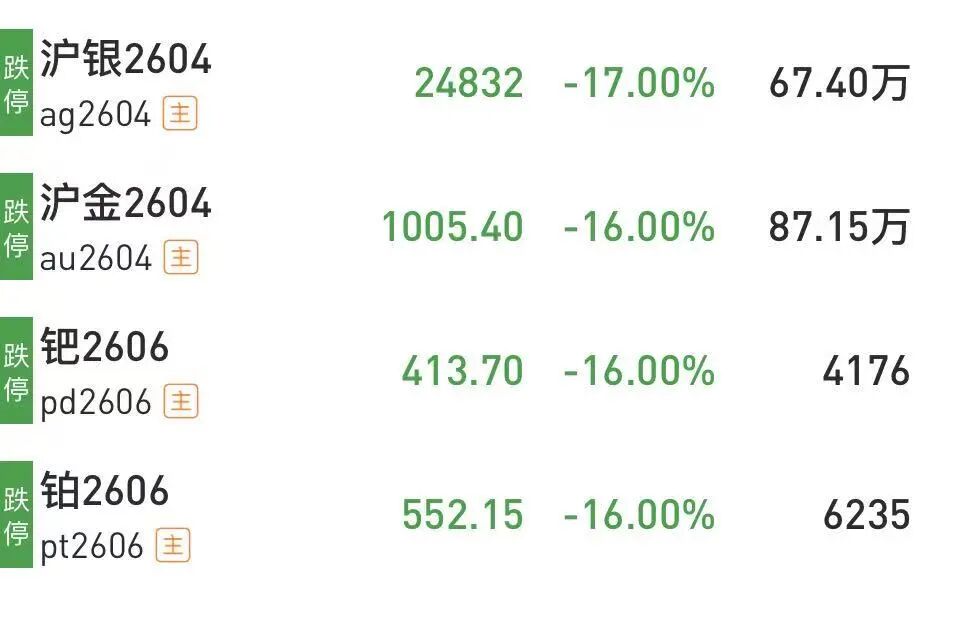 贵金属方面,白银、铂、钯期货主力合约早早封住跌停,沪银期货跌幅17%,铂、钯期货跌幅16%;黄金期货午后触及跌停,跌幅16%。