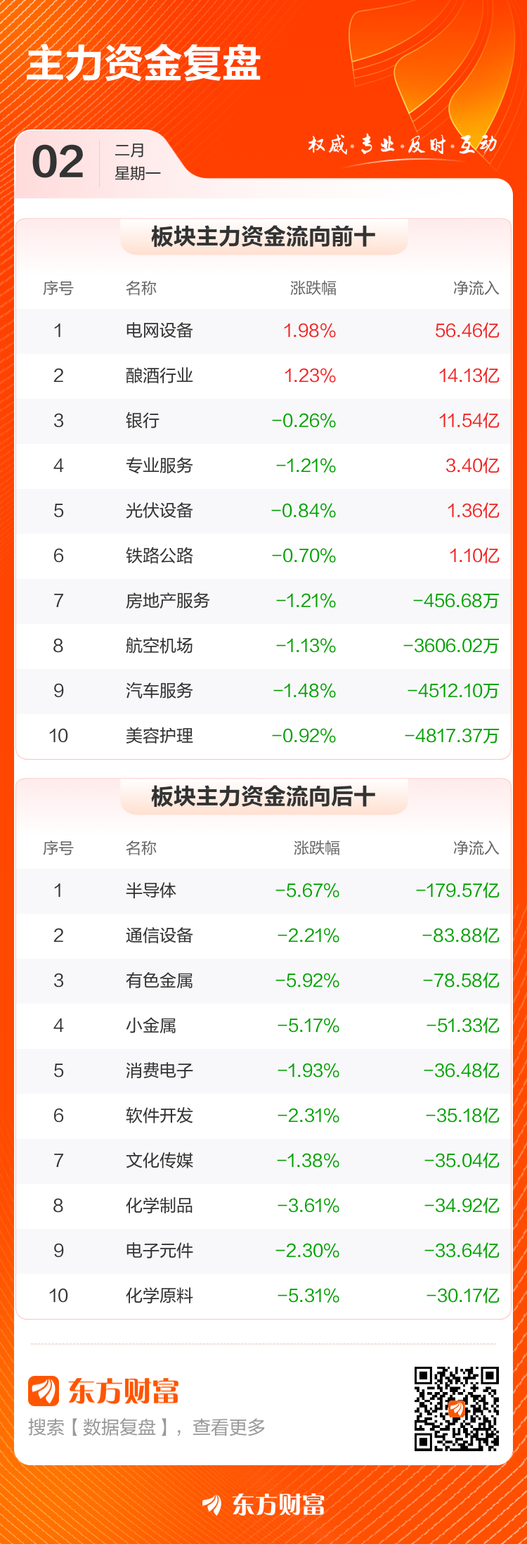 2月2日,沪指跌2.48%,深成指跌2.69%,创业板指跌2.46%。两市成交额2.58万亿,较上个交易日缩量2508亿。数据显示,今日大盘主力资金净流出1019.98亿。电网设备、酿酒行业、银行等板块主力资金流入排名居前,其中电网设备净流入56.46亿元。