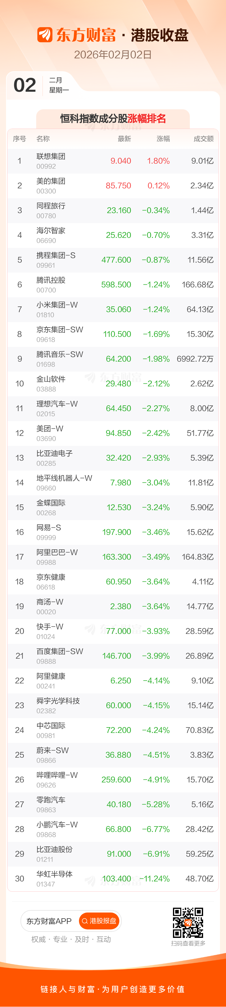 港股2月2日收盘走低,恒生指数收报26775.57点,跌611.54点,跌幅2.23%;恒生科技指数收报5526.31点,跌191.87点,跌幅3.36%。恒生指数成分股中金沙中国有限公司、联想集团、银河娱乐涨幅居前,比亚迪股份、中国联通、紫金矿业跌幅靠前。恒生科技指数成分股中联想集团、美的集团、同程旅行涨幅居前,华虹半导体、比亚迪股份、小鹏汽车-W跌幅靠前。