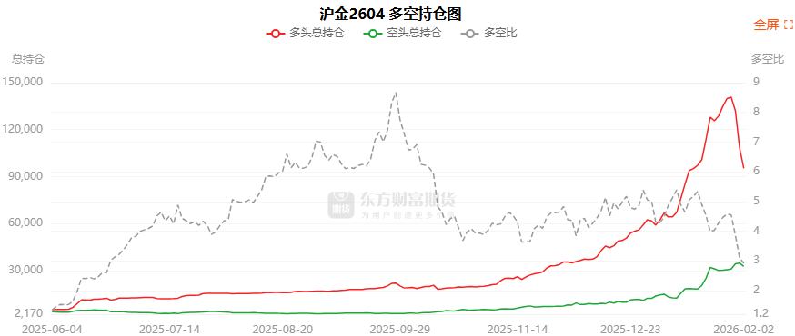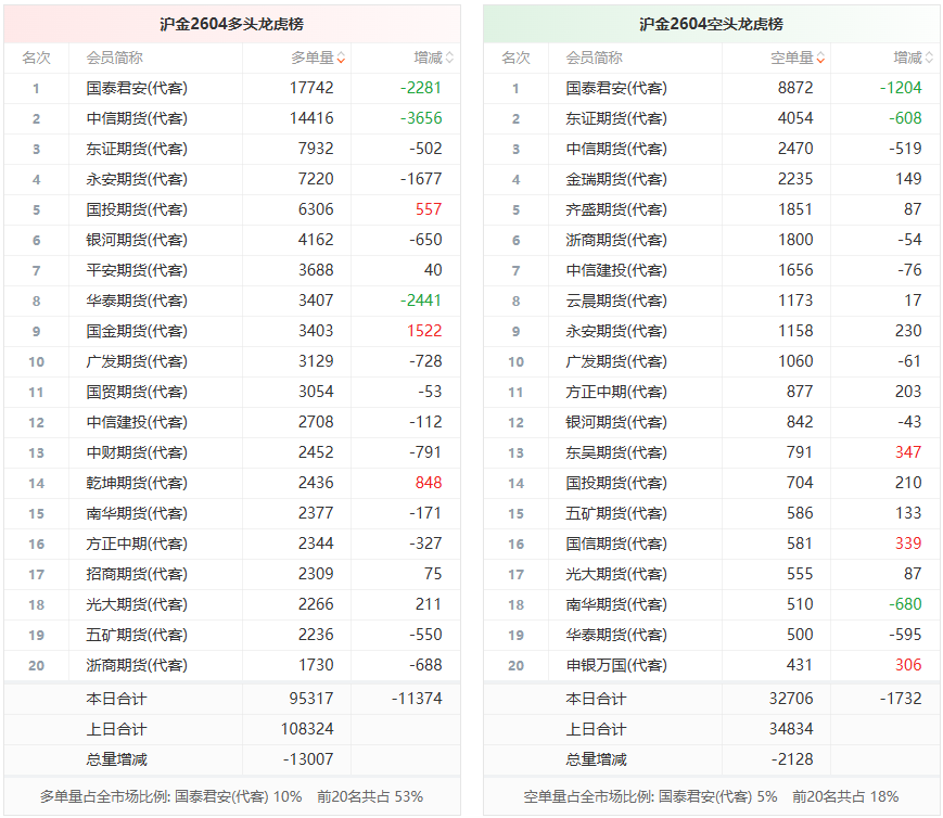 总体而言,沪金2604合约今日减仓下行,多空持仓排名前20席中,多空双方均呈退场态势,多头退场意愿强于空头。