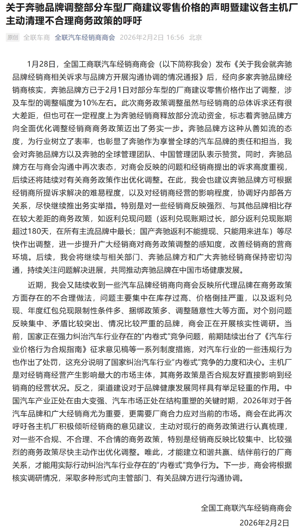 2月2日,全国工商联汽车经销商商会发文称,经向多家奔驰品牌经销商核实,奔驰品牌方已于2月1日对部分车型的厂商建议零售价格作出了调整,涉及车型的调整幅度为10%左右。