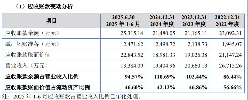 在业绩下滑的同时,公司应收账款高企。报告期各期末,公司应收账款余额占当期营收比例长期处于高位,2023年和2024年这一比例分别为102.44%和110.69%,至2025年6月末虽略有回落,仍达94.57%。