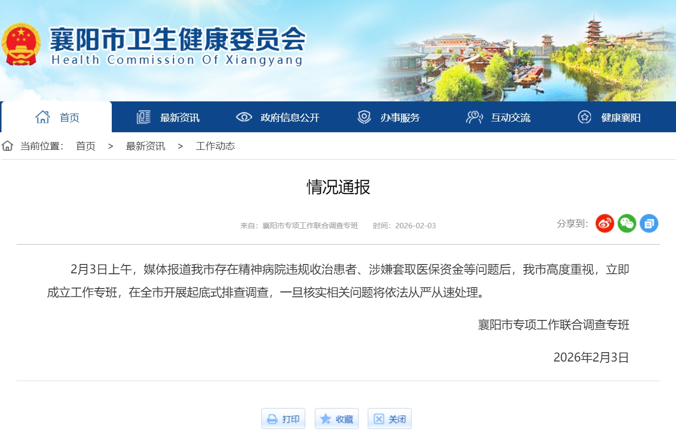 湖北襄阳卫健委通报“精神病院违规收治患者、涉嫌套取医保资金”:已成立工作专班 开展起底式排查调查