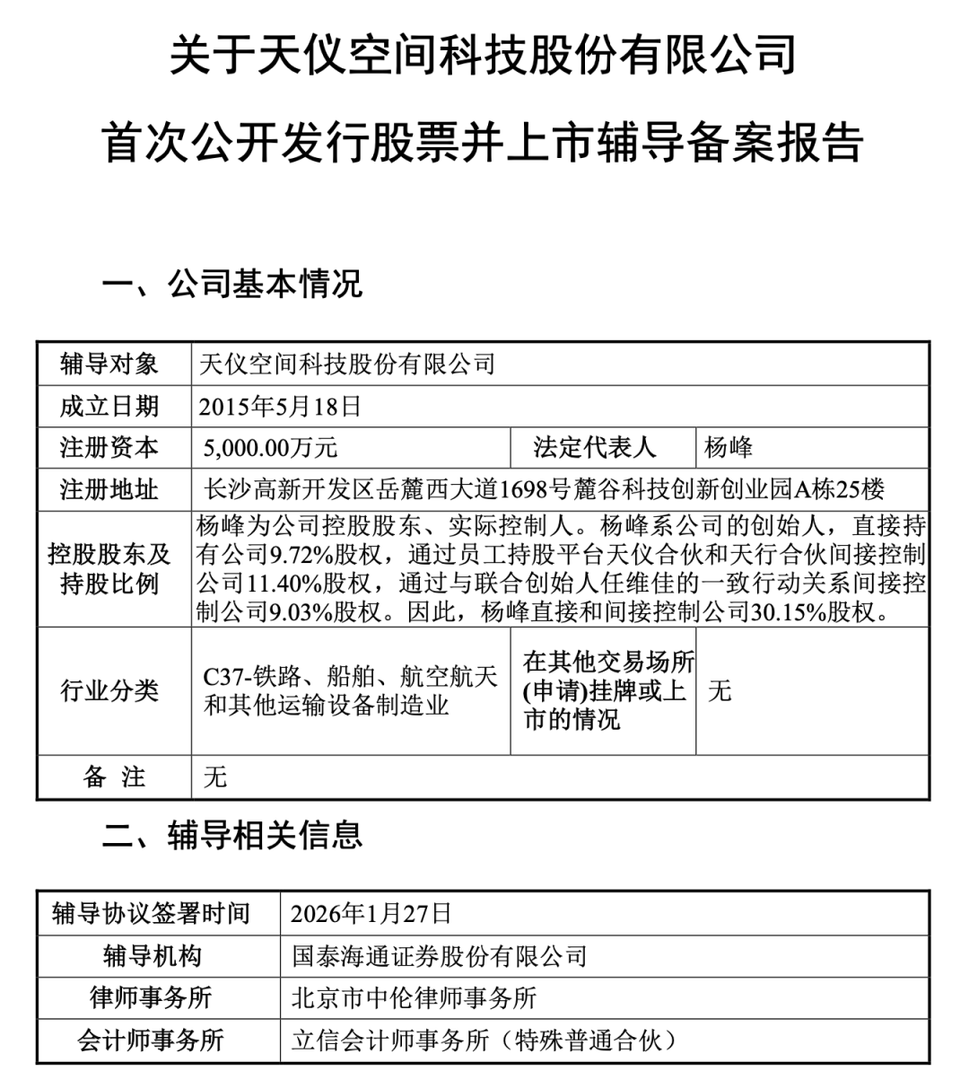 2月2日,头部商业卫星企业天仪空间科技股份有限公司(以下简称“天仪空间”)在湖南证监局完成IPO辅导备案,辅导机构为国泰海通证券股份有限公司,律师事务所为北京市中伦律师事务所,会计师事务所为立信会计师事务所(特殊普通合伙)。