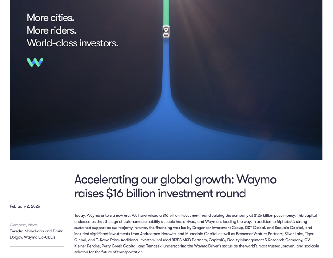 2024年10月,Waymo曾完成56亿美元融资,当时估值超过450亿美元。与之相比,本轮融资后公司估值已实现翻倍增长。