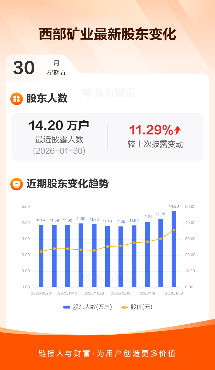 西部矿业最新披露数据显示,截至1月30日公司股东户数为14.20万户,较上期(2026年1月20日)增加1.44万户,增幅为11.29%。户均持有流通股数量由上期的1.87万股下降至1.68万股,户均持股金额由上期的56.18万元增加至59.74万元。
