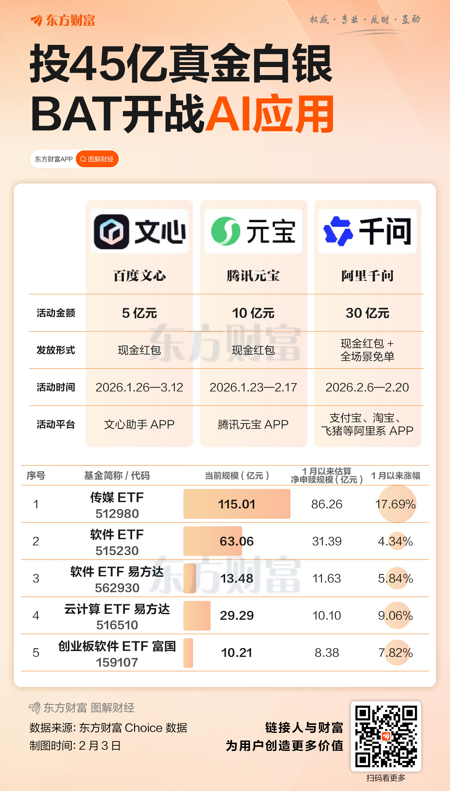 事实上,自开年以来,AI应用板块就受到市场的持续关注,吸引大量资金流入。综合东方财富妙想大模型及东方财富Choice数据信息,截止2月2日,当前市场上规模在10亿元以上的AI应用相关主题基金主要有5只。其中传媒ETF是当前市场上规模最大(115.01亿元),且1月以来净申购规模(86.26亿元)和涨幅(17.69%)最大的相关ETF;软件ETF当前规模和1月以来净申购居第二;云计算ETF易方达和创业板软件ETF富国1月以来涨幅居二三位,分别为9.06%和7.82%。