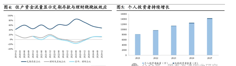 理财规模增长动力或仍主要来自“存款搬家”与居民存款重定价后的替代效应。赎回潮后,居民在定期存款与理财之间的配置跷跷板更为清晰;伴随多轮降息及高息存款重定价推进,理财对部分储蓄资金的边际吸引力抬升。与此同时,2026年或迎来存款到期高峰(约55–60万亿元),剔除续作仍可能有约2–4万亿元向理财、公募基金、股票等资管产品温和分流,形成持续的增量补给。投资者规模增长亦形成验证:截至2025年末持有理财的投资者1.43亿,其中个人1.41亿,同比增14.31%。